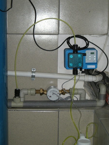 Через месяц после установки бойлера (125л) появился неприятный запах сероводорода и серая примесь в горячей воде - продукт жизнедеятельности бактерий, для которых условия в бойлере более чем благоприятные для активного размножения. Периодическая промывка бойлера и системы хлором не давала практически никакого эффекта. Было предложено применить Dutrion для дезинфекции воды и окисления железа, и установить станцию пропорционального дозирования. После установки оборудования (подмес диоксида хлора осуществляется перед фильтрами механической и комплексной очистки) и калибровки дозирования (10 дней при дозе 0,2 мг/л) была выставлена доза – 0,4 мг/л. Через семь дней неприятный запах уменьшился, вода стала чище. Дозировка была увеличена до 0,6 мг/л.